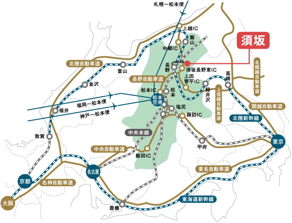 または 関越自動車道・藤岡JCT→更埴JCT→上信越自動車道→上田菅平IC→国道144号→菅平高原経由→須坂市 - 大阪方面