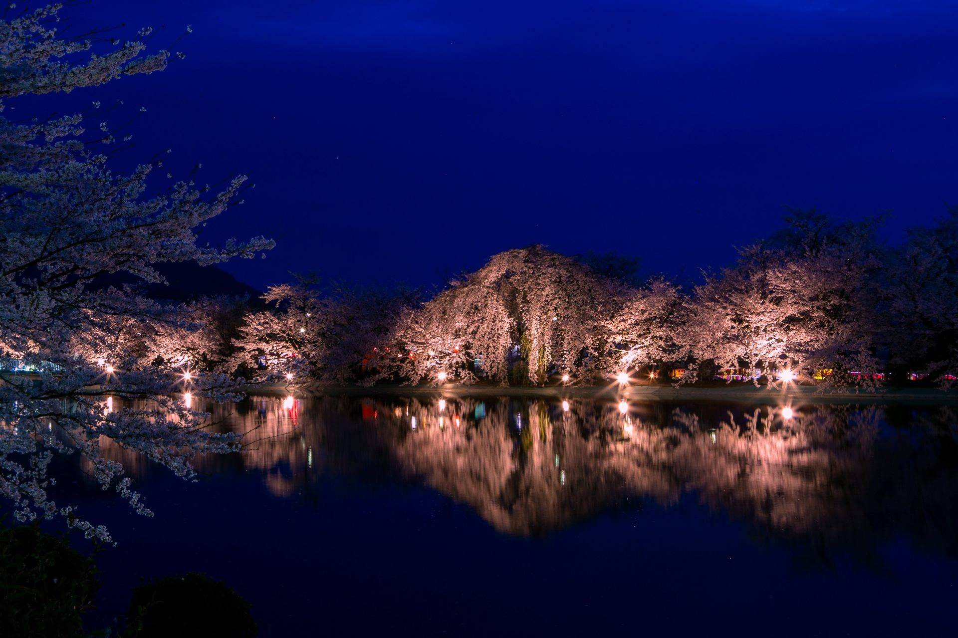 池のほとりに咲き誇る桜が水面に映り、光に照らされてゆらめく姿は、昼間とはまったく違う表情を見せてくれます。