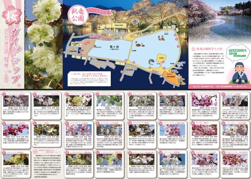 臥竜公園さくらまつりは、須坂市が誇る春の一大イベントです。公園一帯を彩る約160本のソメイヨシノが一斉に咲き誇り、池の水面に映る“逆さ桜”は訪れる人々を魅了します。昼間は淡い桜色に包まれた穏やかな風景が広がり、夜にはライトアップされた幻想的な夜桜が楽しめ、時間帯によって異なる表情を見せてくれるのも魅力です。