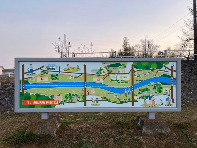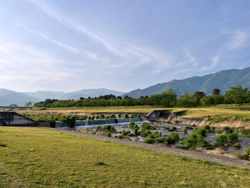 須坂市の中心部を流れる百々川沿いに広がる「百々川緑地」は、自然とふれあいながら心地よい時間を過ごせる市民の憩いの場です。広々とした芝生広場では、家族連れがピクニックを楽しんだり、子どもたちが元気に駆け回ったりと、のびのびとした時間が流れます。