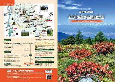 群馬県との境にある標高2,000mの破風岳の西側に広がるなだらかな高原で、須坂駅より車で約50分、曲がりくねった20kmほどの山道を上がりつけたところが乳山牧場を中心にした五味池破風高原自然園です。五味池とは大池、苦池、西五味池、よし河原池、つつじが池の総称。 この周辺には100万株ともいわれるレンゲツツジが群生し、花の盛りの6月下旬には高原一帯はツツジの花で彩られます。牧歌的な情緒あふれる高原からの、北信五岳・北アルプスの眺めも格別です。また、園内ではワラビやウド、コシアブラ、タラの芽など山菜も豊富に採れます。