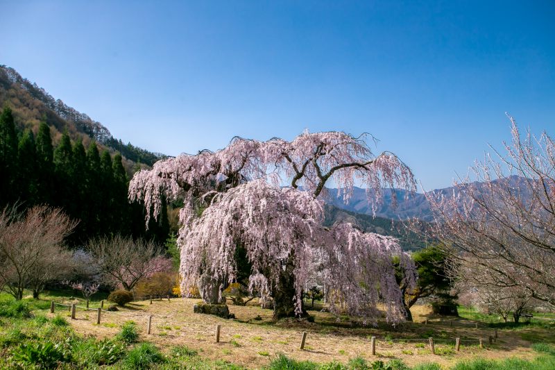 須坂市指定天然記念物の桜 - 大日向観音堂のしだれ桜 素朴な里山の風景に佇む 大日向観音堂の隣に寄り添うのは、一対の見事なしだれ桜。樹齢はおよそ250年、高さ約20メートルにも及ぶその姿は、長い歳月を経てなお力強く、優美に枝を広げています。寛永元... -